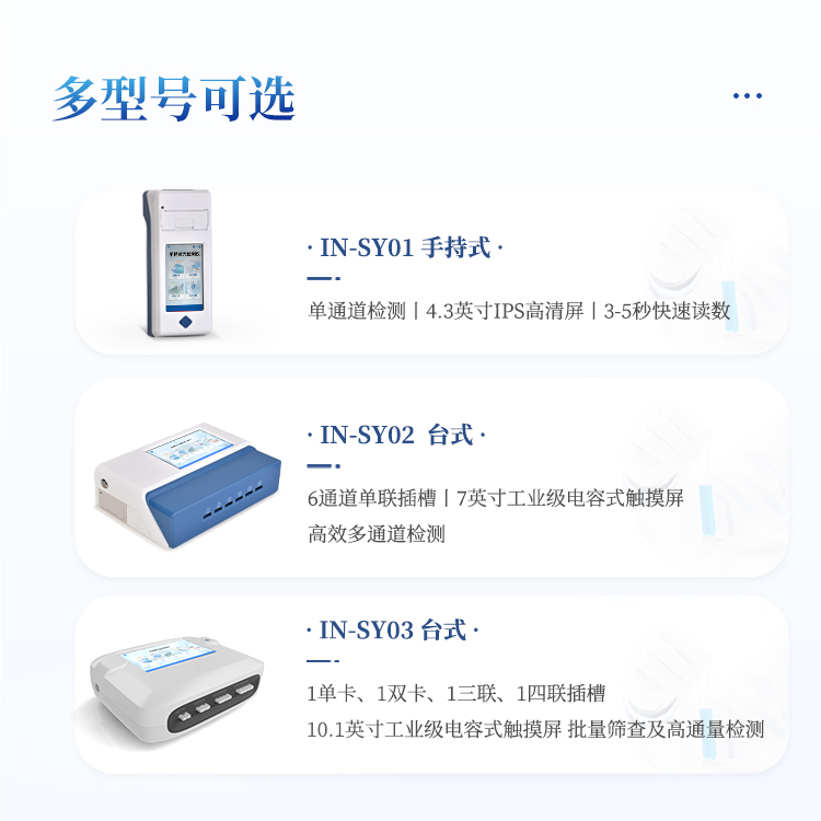 9、检测时间:< 5秒 (单卡及多联卡);可对样本进行胶体金定性/半定量检测。